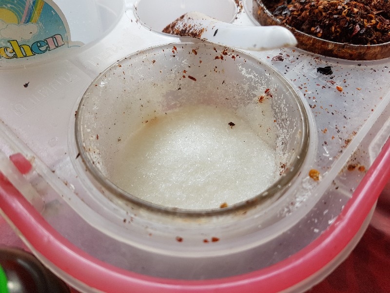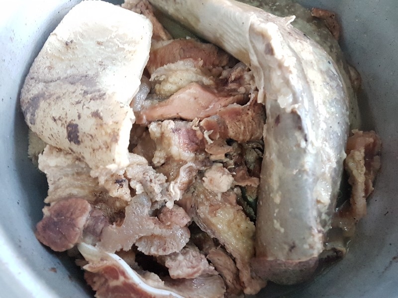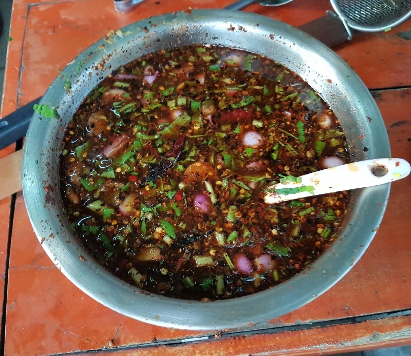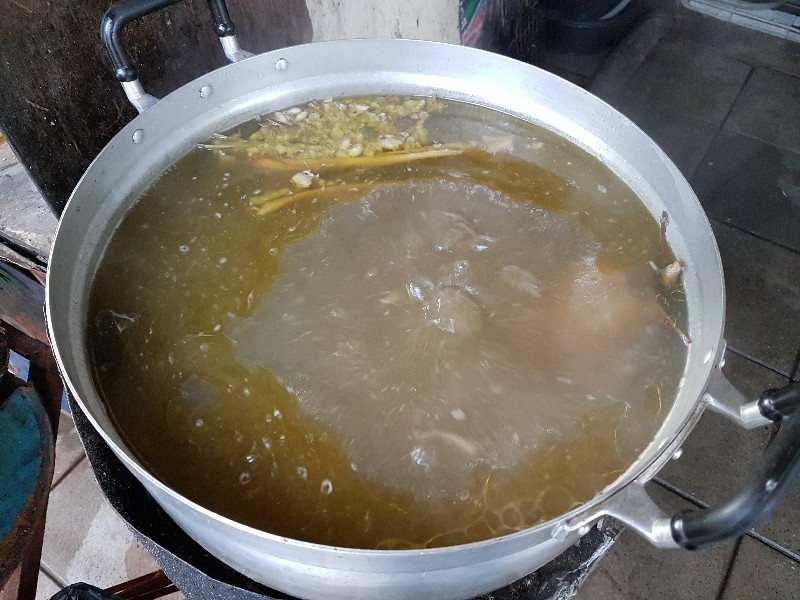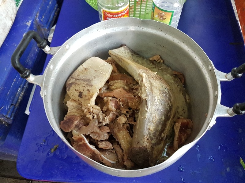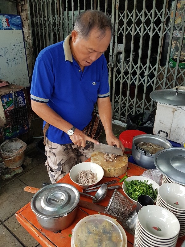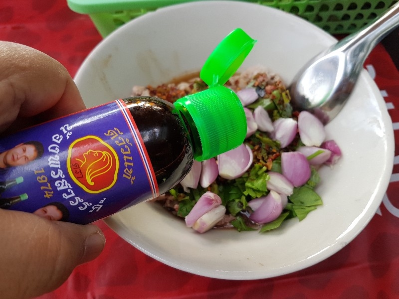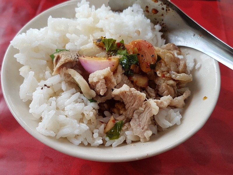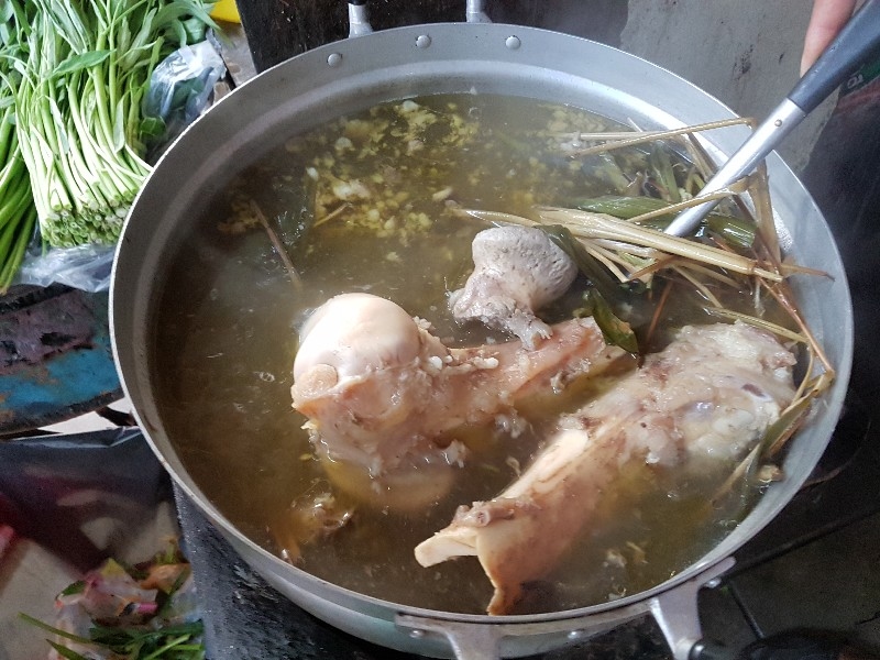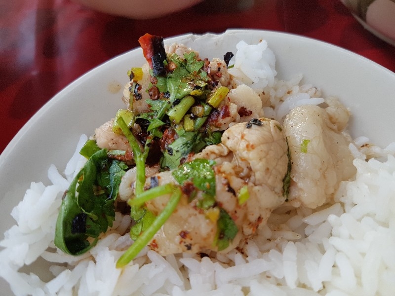 บางวัน ชายกางไปขอให้ป๋าเหมี่ยว ลวกเนื้อสดติดมัน แบบผ่านน้ำซุปร้อน ๆ ครั้งเดียวพอ เนื้อสดหั่นแล้ว ราดน้ำซุปร้อน ๆ ใส่ลงไป ใช้ทัพพีสับ ๆ ให้แตกตัวหน่อย โดนน้ำซุปร้อน ๆ ทั่วกัน รินน้ำออก เป็นอันใช้ได้ ใส่ผักโรย ราดน้ำจิ้มใส่ลงไปเลย ชายกางขอหอมแดงหั่นเพิ่มกลิ่น รสหน่อยครับ ใส่ดีลงไปหน่อย พอมีรสขมเบา ๆ พอเป็นเสน่ห์แห่งท้องทุ่ง คลุกให้ดี แล้วลองใส่ปากดูเถอะคุณเอ๋ย ข้างหน้าชายกาง มีรุ่นใหญ่ไฟกระพริบ นั่งหั่นหอมแดงกับกระเทียมใส่น้ำจิ้มอย่างมุ่งมั่น พี่เค้า เล่นบทโหดมากครับ น้ำจิ้มแจ่ว โกยมาแห้ง ๆ ใส่หอมแดงกับกระเทียมหั่นหนักมาก แกบอกว่า มันโคตรจะถึงใจเลยครับ ต้มเครื่องในของชายกางก็มาวางพอดี ยังแจ่มเช่นเดิม 80 บาทครับ ชายกางนำเรื่องราวของป๋าเหมี่ยว ลงใน FB คนตามมากินกันเยอะ จนต้องต้มเพิ่มอีกหม้อ เพิ่มของอีกเยอะเลย เพื่อรองรับลูกค้าที่ตามเฟสมา แถมเปิดตัวแฟนที่กลับมาช่วยป๋าเหมี่ยวขายของเข้าไปอีก ช่วงนี้ป๋าเลยอารมณ์ดี โลกสีชมพูไปโม๊ดเลยแหละ
