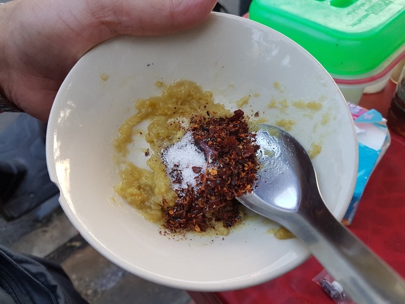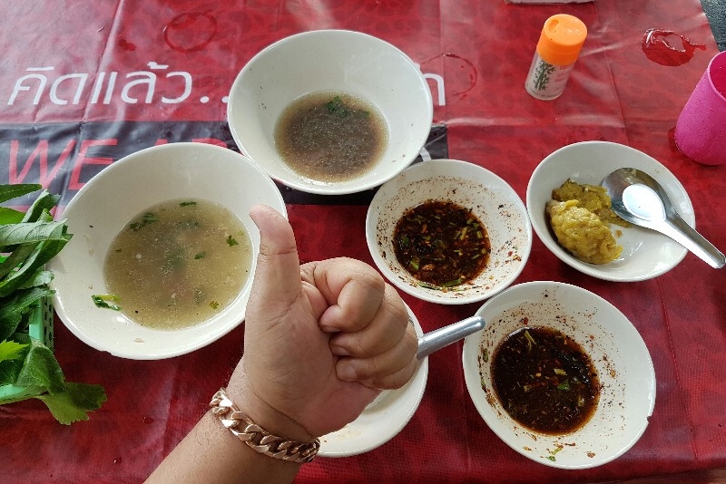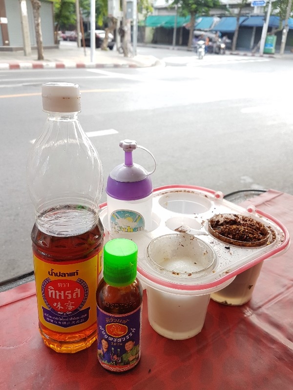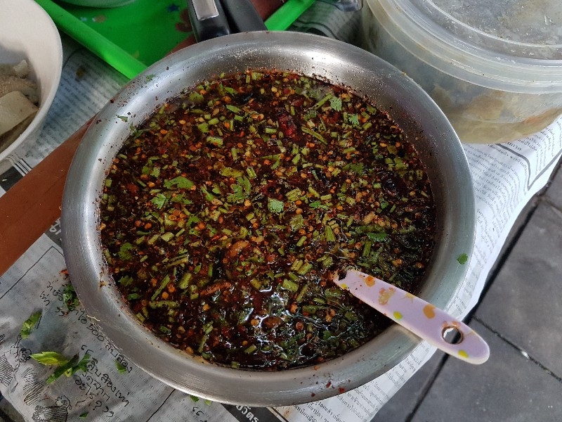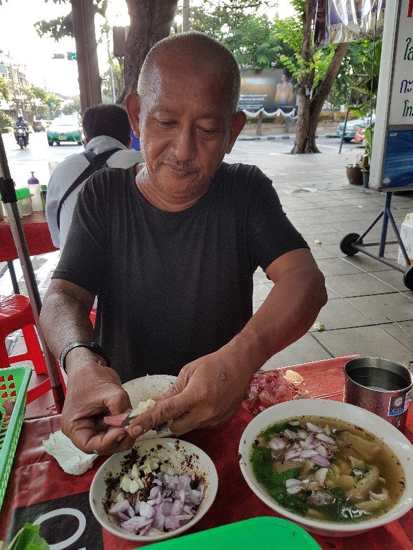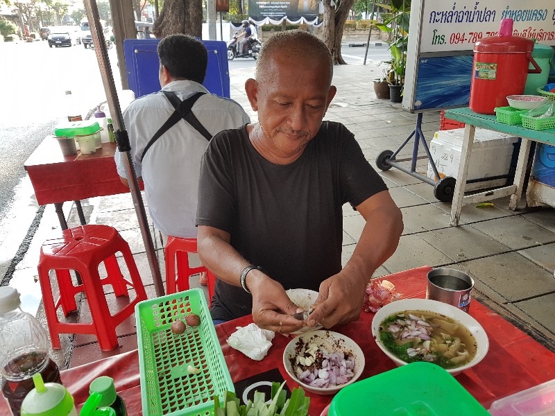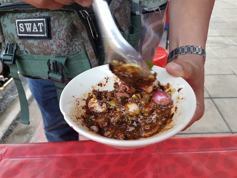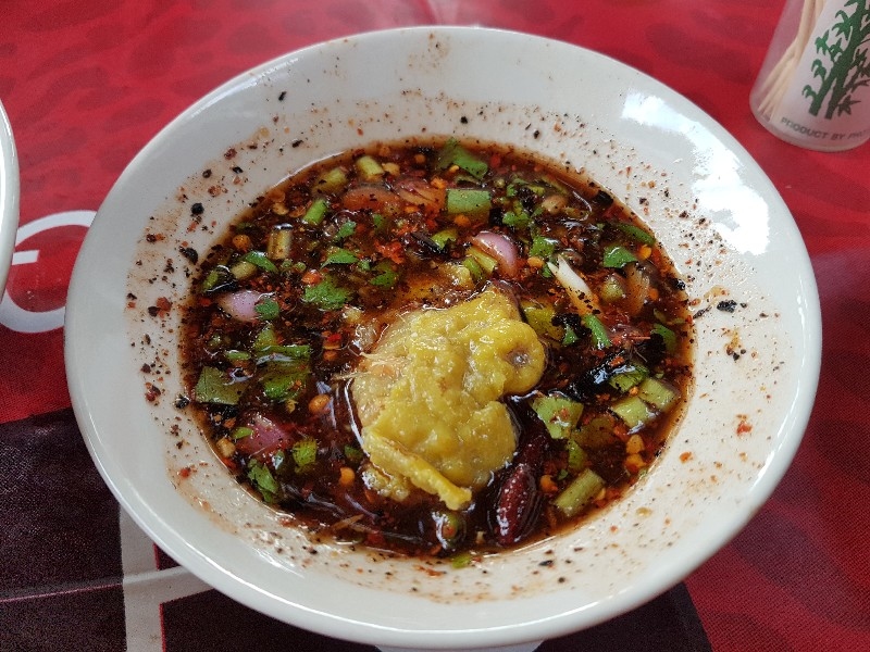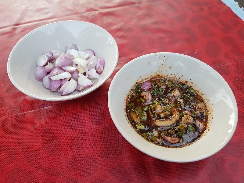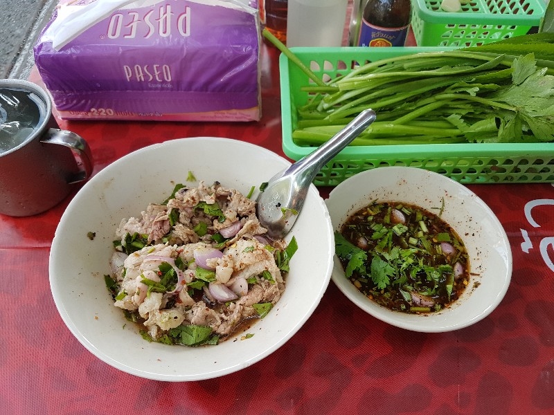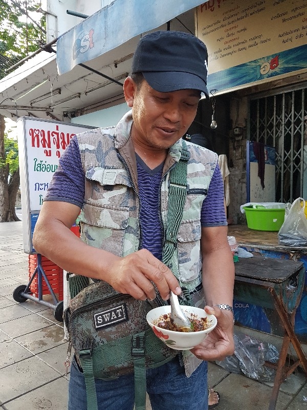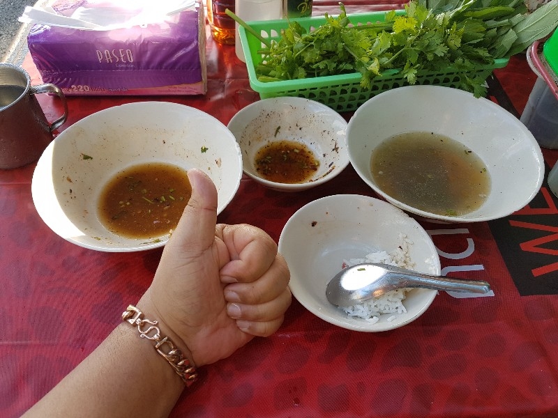 วันนี้ ชายกางสั่ง ขอบกระด้งลวกจิ้มมาชามนึง 80 บาท ป๋าเหมี่ยวรู้ใจกันแล้ว น้ำจิ้มแจ่ว มาพร้อมหอมแดงหั่นเลยครับ และต้องมีทุกครั้ง 1 ชาม ต้มเครื่องในวัว เป็นมื้อเช้าที่มีความสุขจริง ๆ ครับ เจอแฟนพันธุ์แท้ป๋าเหมี่ยว โชว์น้ำจิ้มแบบที่พี่เค้าชอบอีกแล้ว พี่เค้าบดมะกรูดกับพริกป่นที่เผ็ดมาก ใส่ชูรสลงไป บี้ ๆ คน ๆ เติมแจ่ว เติมดีลงไป คน ๆ เอาแค่ข้น ๆ รสแรง ๆ น่าอร่อยอ่ะ พักเดียว เราก็จัดการทุกอย่างหมดไป อิ่มแล้ว ยังใส่ถุงกลับบ้านเป็นเสบียงอีกหนึ่งถุง ( 100 บาท ) ราคาค่าบริการของป๋าเหมี่ยวคือ ใส่ชาม 80 บาท ใส่ถุง 100 บาท ข้าวสวยถ้วยละ 10 บาท น้ำดื่มฟรี บริการตัวเองนะจ๊ะ