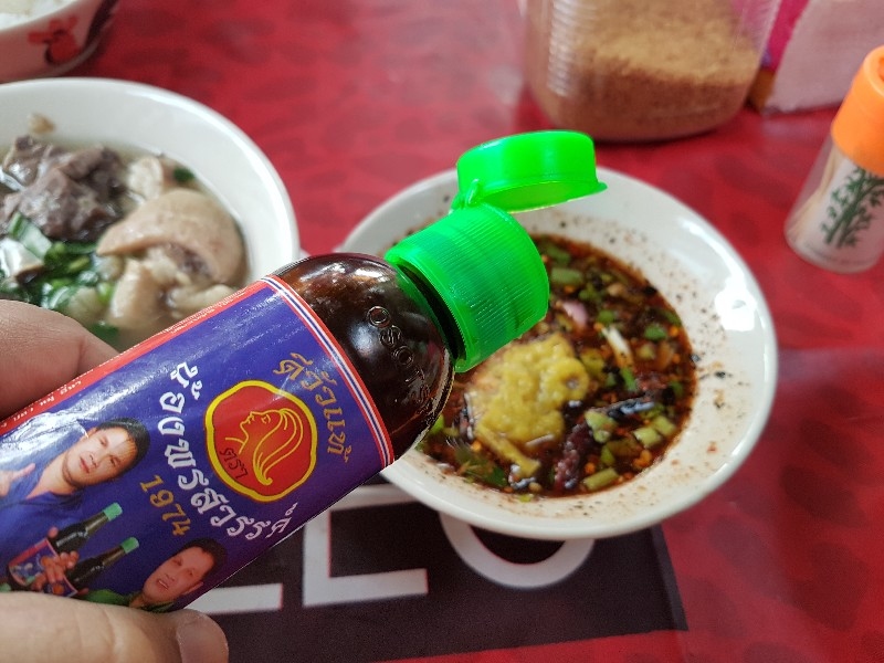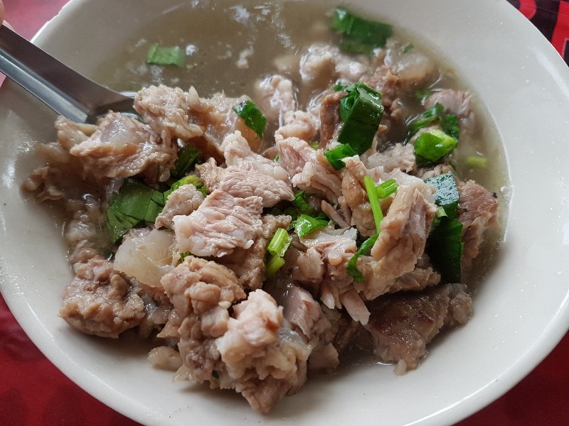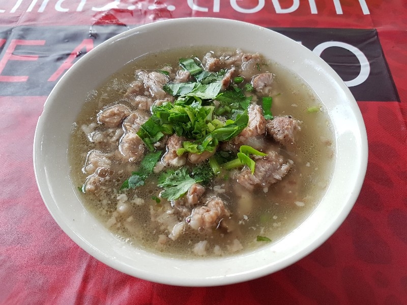 ป๋าเหมี่ยวมีเนื้อสด และเนื้อเปื่อยบริการด้วยนะครับ โดยเนื้อสดจะลวกในชาม พอสุกสะดุ้ง ๆ แล้วมาใส่เนื้อเปื่อย ตักน้ำซุปราดลงไปอีกที มันนัวแท้น๊อ บนโต๊ะ มีเครื่องประทินรสที่พี่น้องชาวแท็กซี่ & สามล้อเครื่องท่านขาดมิได้ ป๋าเหมี่ยวจึงมีให้ตักใส่กันตามชอบ นั่นคือ ผงชูรส นั่นแหละครับ และอีกอย่างที่ห้ามขาดคือ ดีขม ๆ สำเร็จรูป ใส่ขวดเล็ก ๆ ไว้ให้ใส่กันได้ตามชอบ เข้าที่เข้าทางแล้ว ชายกางสั่งของชอบกันก่อนเลยนะครับ ชามแรกเป็นต้มเนื้อเปื่อย และเนื้อสด 80 บาท เนื้อสดนั้น ลวกในชามครั้งเดียว มาใส่เนื้อเปื่อยอีกหน่อย ราดน้ำซุป ใส่ผักโรย เป็นอันใช้ได้ อีกชามเป็นต้มเครื่องในใส่ทุกอย่างที่ป๋ามีครับ ม้าม ขอบกระด้ง ปอด ไส้ รวมตัวกันมา น่ากินที่สุดครับ น้ำจิ้มมากันถ้วยโต ๆ ขอมะกรูดต้มเปื่อย ๆ มาหน่อย ใส่ในน้ำจิ้มลงไป แล้วพรมดีขม ๆ ใส่ไปหน่อย บี้ ๆ คน ๆ ให้เข้ากันดีครับ ข้าวสวยมาถ้วยนึง ผักสดมาแกล้มกันไป ทั้งผักบุ้งจีน คึ่นไช่และผักชีฝรั่ง รวมแล้วเป็นมื้อเช้าที่มีความสุขดีมากครับ