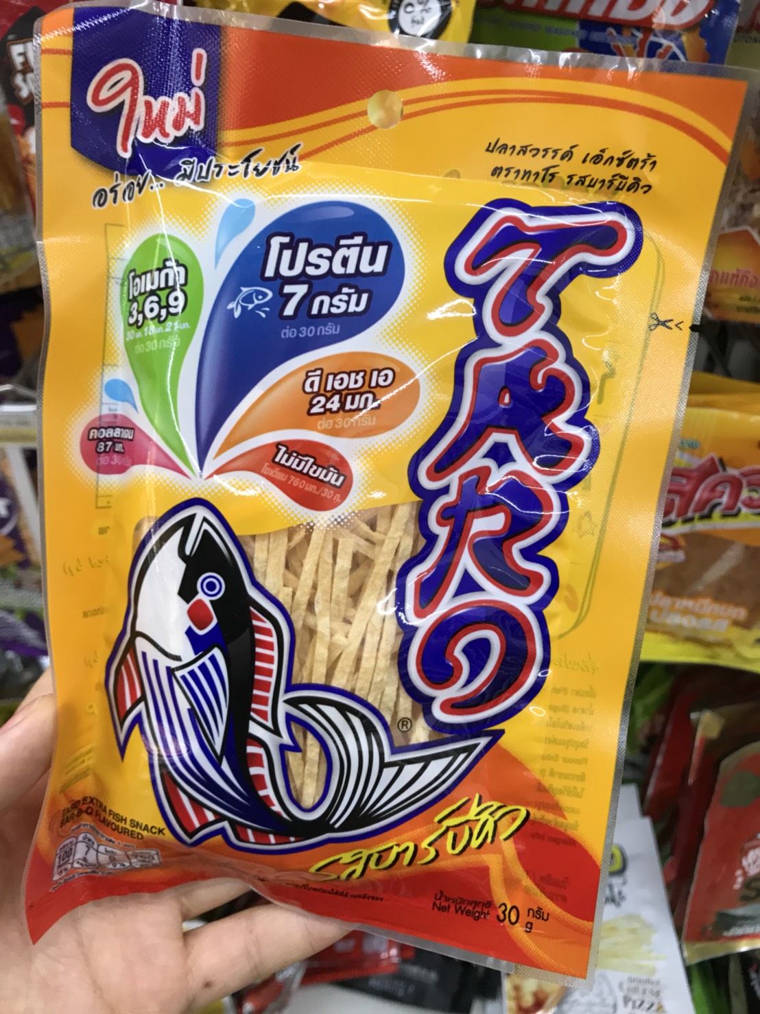 เชื่อว่าหลาย ๆ คนชอบกินมาก ไอ้เจ้าปลาเส้นเนี่ย เพราะว่ามันอร่อย กินเพลิน ถ้าใครเอาไปเข้าไมโครเวฟ เอาไปอบแล้วละก็ ความอร่อยเพิ่มทวีคูณเลย ซึ่งห่อนึงให้พลังงานประมาณ 100 แคลอรี่ เท่านั้น นี่เป็นห่อใหญ่แล้วด้วยนะ คือดีไว้กินตอนระหว่างมื้อหิว ๆ ได้เลย