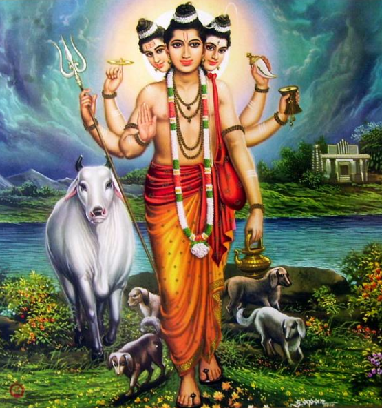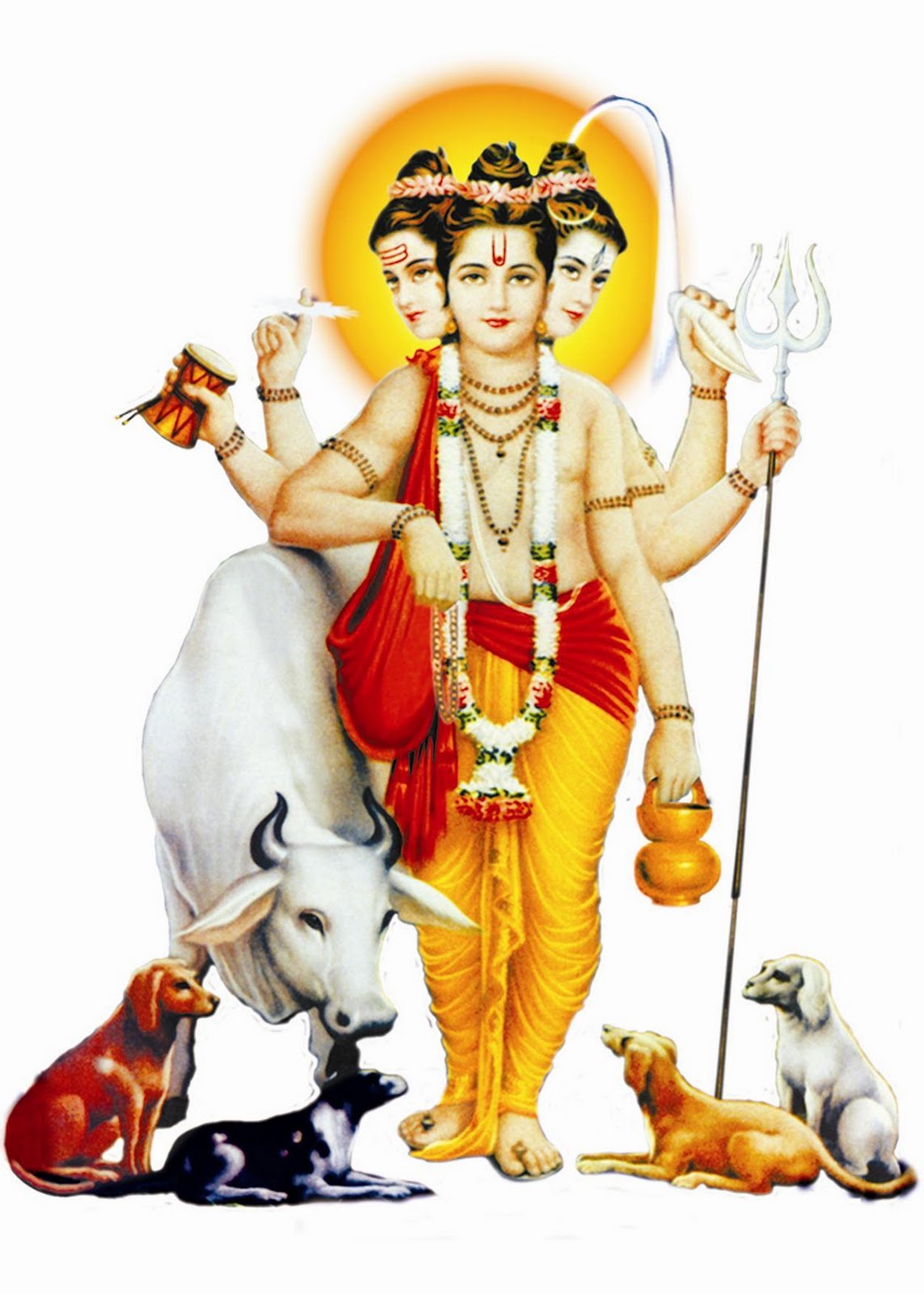 "พระตรีมูรติ" (เทพทัตตาเตรยะ) เป็นรูปหนึ่งของพระวิษณุ (นารายณ์) ที่รวมเทพทั้งสามไว้ในพระองค์ มีพระเศียร 3 เศียร แทนพระพรหม พระวิษณุ และพระศิวะ มีสุนัข 4 ตัวติดตาม สุนัขเป็นตัวแทนพระเวททั้ง 4 และมีแม่โคศักดิ์สิทธิ์ ติดตามด้วย 1 ตัว