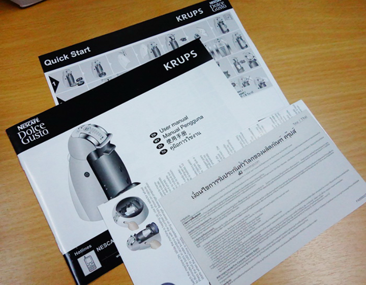 ข้างในมีคู่มือกับใบรับประกัน และโบรชัวร์แนะนำตัว Nescafe Dolce Gusto
