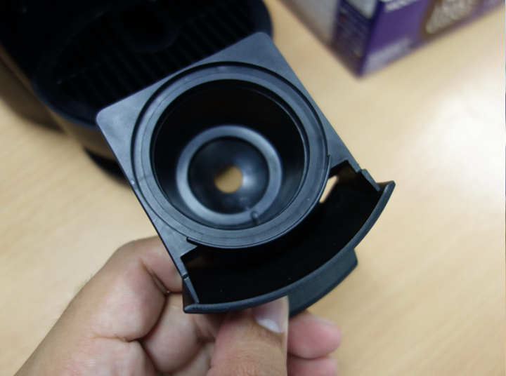 จากนั้นก็เปลี่ยนแคปซูลกาแฟออก ใส่แคปซูลนมเข้าไปแทน อย่าลืมปรับระดับขีดปริมาณน้ำนะครับ
