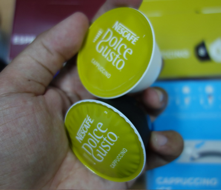 คือเจ้าแคปซูลเนี่ย เราจะใช้ 2 อัน ต่อการชง 1 แก้วครับ อันนึงจะเป็นกาแฟ ส่วนอีกอันจะเป็นนม สังเกตง่ายๆ ว่าอันที่เป็นนมตัวแคปซูลจะเป็นสีขาวครับ อย่างคาปูชิโนตัวกาแฟจะกดน้ำ 1 ขีด และนม 6 ขีด (สังเกตขีดได้ที่ฝา)