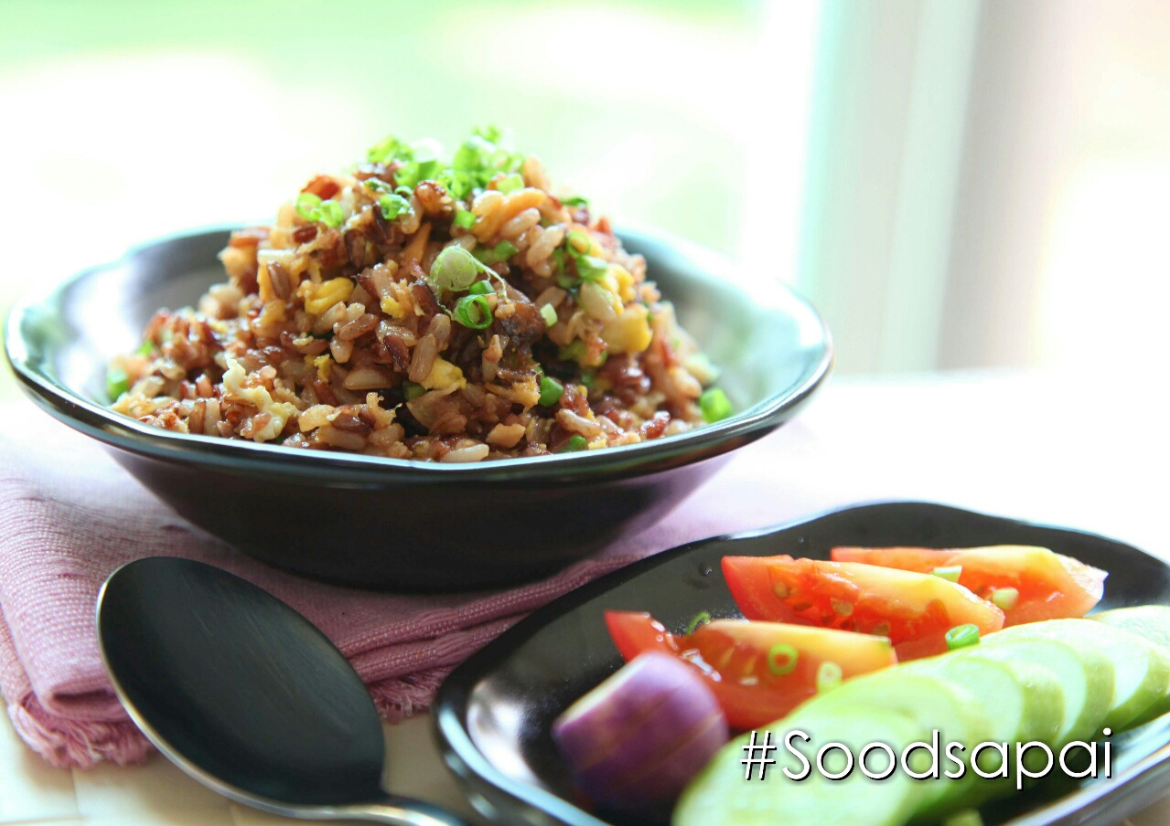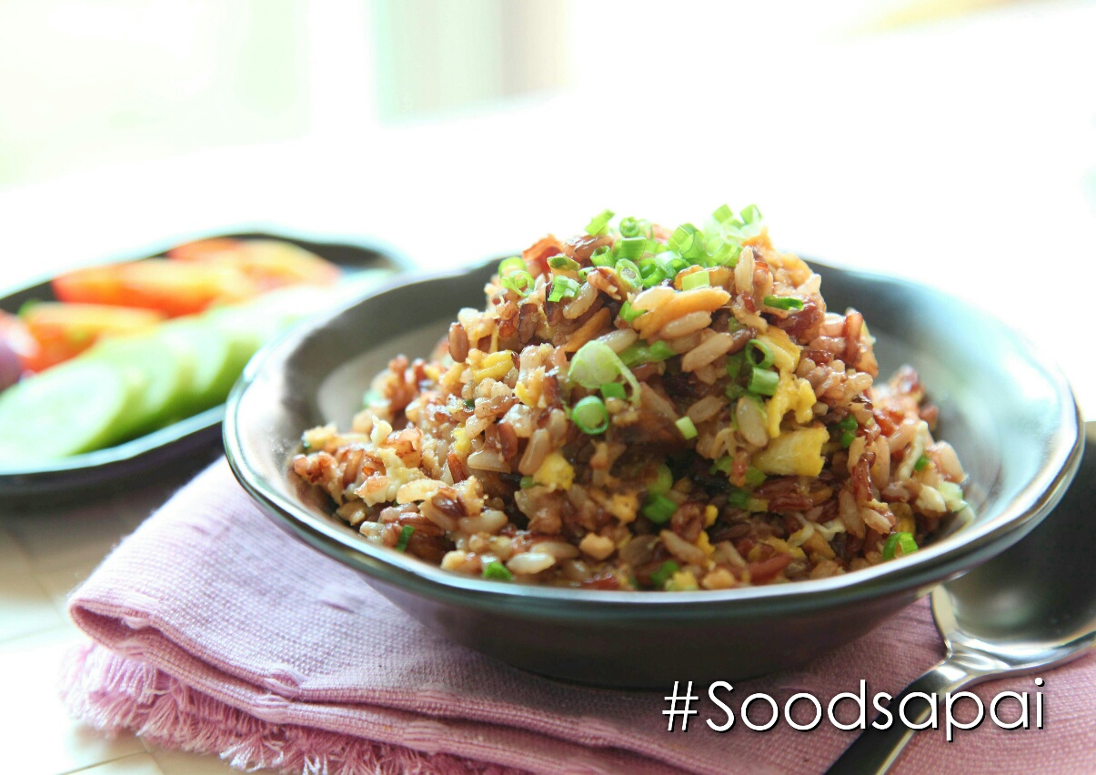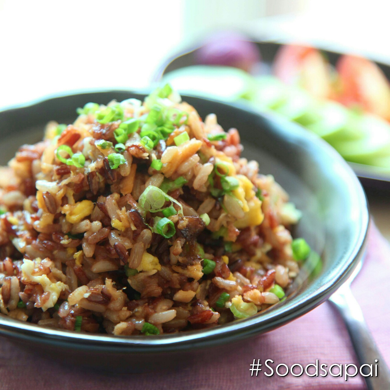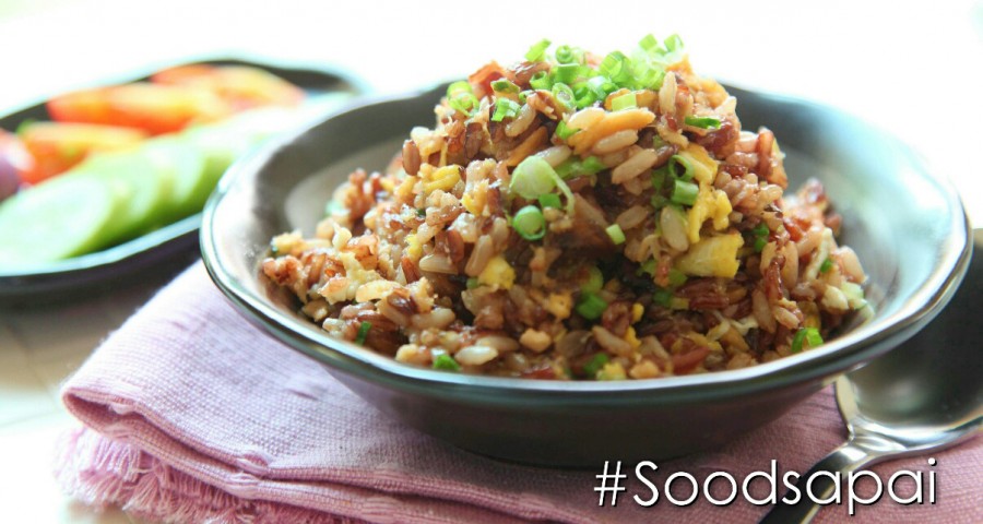 4. ใส่เนยในมุมที่ว่างอยู่พอเนยละลาย ใส่ไข่ลงไปตีไข่ให้เข้ากันและนำไปผัดรวมกับข้าว ปรุงรสด้วยซีอิ๊วขาวกับโชยุ พริกไทยป่น ชิมรสตามชอบ ใส่หอมซอย ปิดไฟ คลุกเคล้าให้เข้ากัน ตักเสริฟพร้อมแตงกวากับมะเขือเทศ (ของหนุ่ยแอบมีมะเขือม่วง ติดไปด้วยค่ะ เพราะน้องไทมชอบทานมะเขือม่วงมาก บางมื้องงกับเธอเหมือนกัน ทานข้าวเปล่ากับมะเขือม่วง