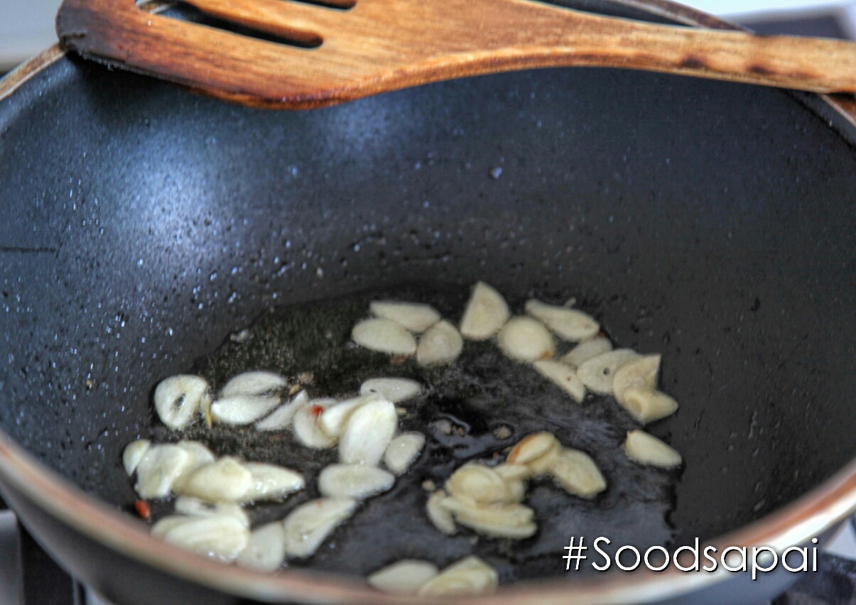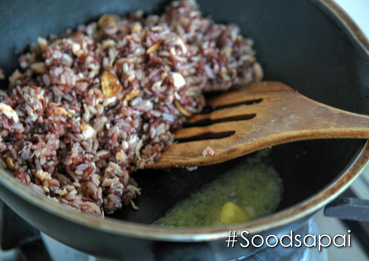 3. ตั้งกะทะใส่น้ำมันพอร้อน นำกระเทียมที่หั่นชิ้นไว้ลงทอดก่อน พอเริ่มเหลือง ใส่ข้าวสวยลงผัดให้เข้ากันจากนั่นใส่เนื้อปลาลงไปผัดให้เข้ากัน แล้วพักข้าวไว้มุมหนึ่งของกะทะ