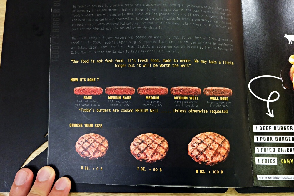 ถ้าสั่งเบอร์เกอร์เนื้อวัว เราจะสามารถเลือกระดับความสุกของเนื้อได้ด้วยครับ แนะนำเป็น Medium Rare หรือ Meduim จะแจ่มมาก นอกจากนั้นสามารถเพิ่มขนาดของเนื้อได้ ซึ่งเริ่มต้นจะอยู่ที่ 5 oz (ประมาณ 140 กรัม) โดยสามารถเพิ่มเป็นขนาดสูงสุดได้ 9 oz (ประมาณ 250 กรัม)