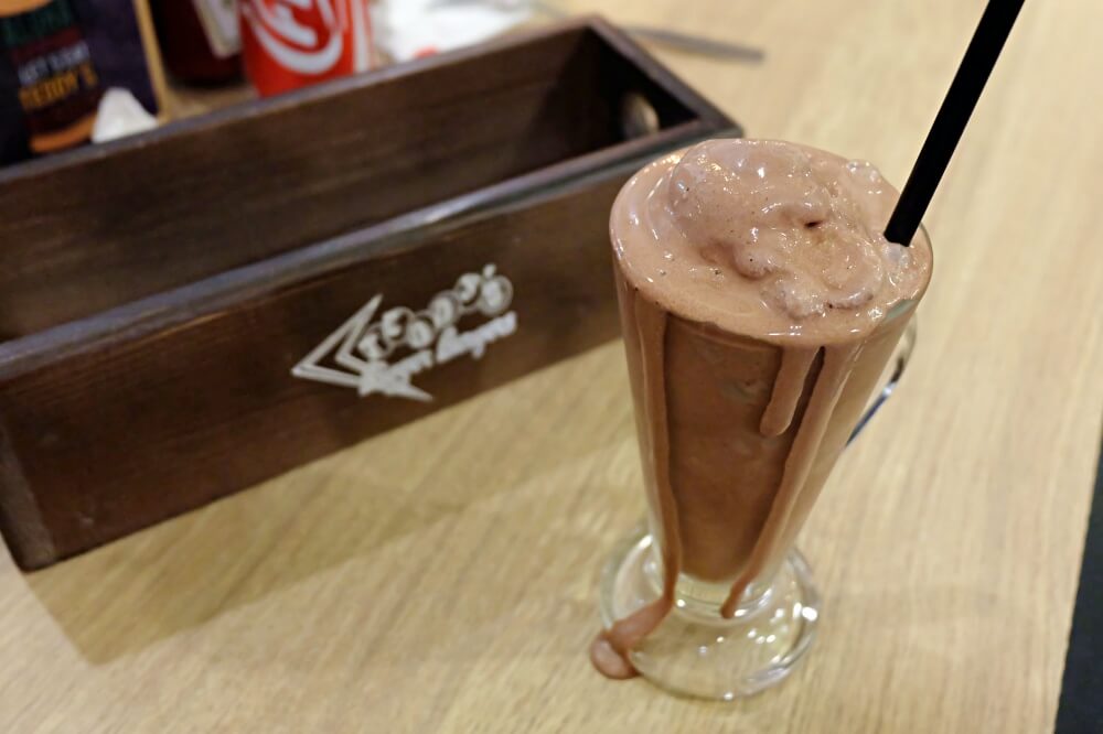 ซึ่งทางร้านยุให้ผมลองมิลค์เชคช็อกโกแลต ก็เอาซะหน่อยครับ เป็นเนื้อแบบไอศกรีมแน่นๆ มาเลย เออ อร่อยจริง เข้มข้นและเนื้อแน่นดี เคยเห็นในซีรีย์ฝรั่งเค้าจะชอบเอาเฟรนซ์ฟรายมาจิ้มกินกับมิลค์เชคแบบนี้แหละ (แต่ผมไม่ทานแนวนั้นนะ)