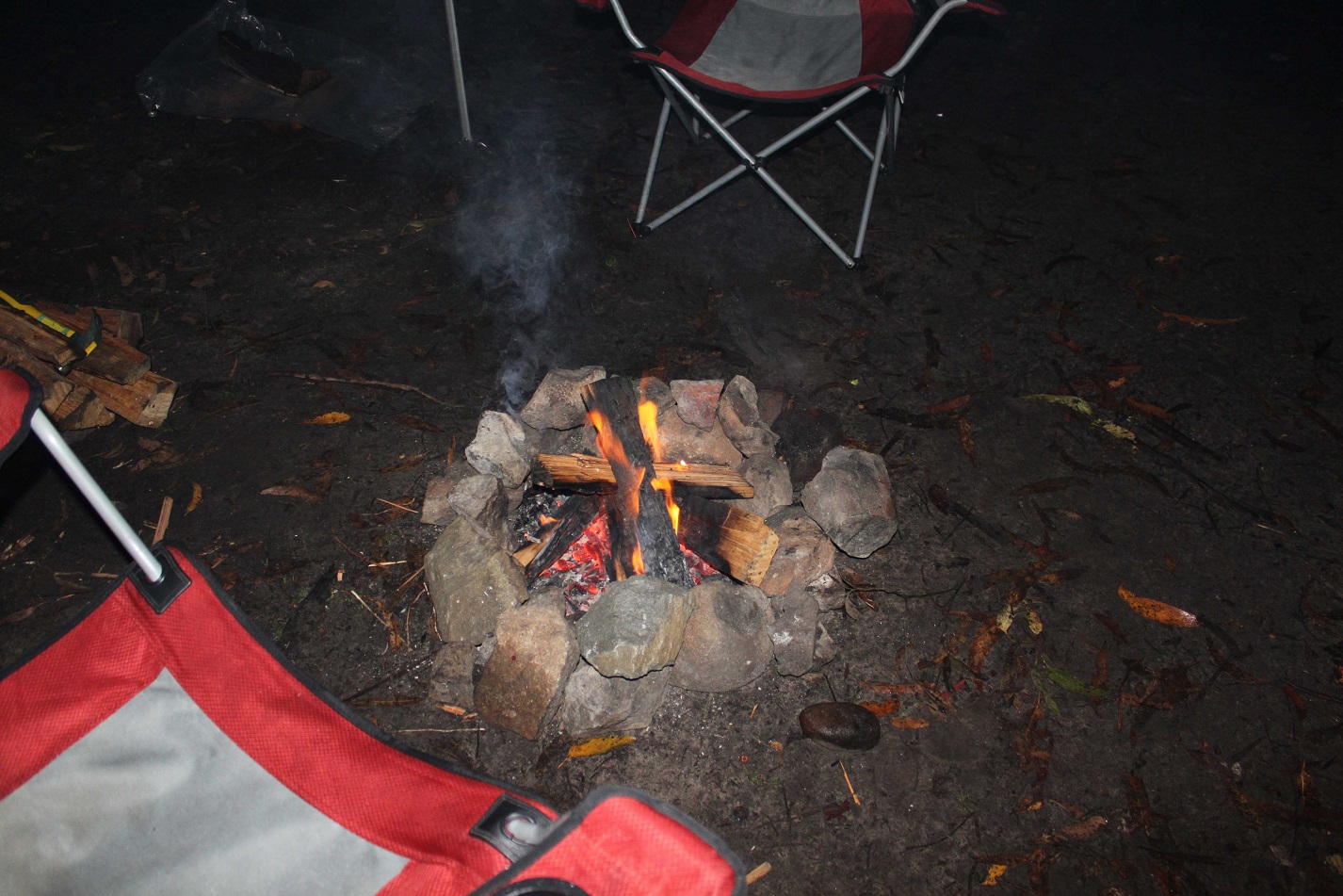 ได้ฟืนชิ้นน้อยมาแล้ว ที่นี้ก็ก่อไฟได้แล้ว มืดพอดีเลย!!