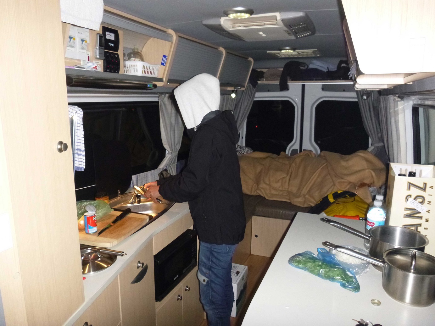 รุ่นนี้มาพร้อมครบทุกสิ่งอย่าง มี tv/dvd ด้วยซึ่งคงไม่ได้ใช้!! ขอเบรคจากการดู TV แล้วไปนอน ดูท้องฟ้า กันสักพักนะค่ะ ^^ จากที่นั่งด้านหน้า สามารถเดินทะลุห้องโดยสาร ด้านหลังได้ มีห้องน้ำในตัวค่ะ มีไมโครเวฟ พร้อมเตาแก๊ส อ่างล้างจานเล็ก ๆ อุปกรณ์ครัวครบครัน กันเลยทีเดียว มี Heater ตู้เย็น และที่สำคัญมีระบบทำน้ำอุ่น สำคัญมาก เพราะ อุณหภูมิ เฉลี่ยไม่ถึง 10 องศา มีโต๊ะทานอาหาร และที่นอนสำหรับสองคน