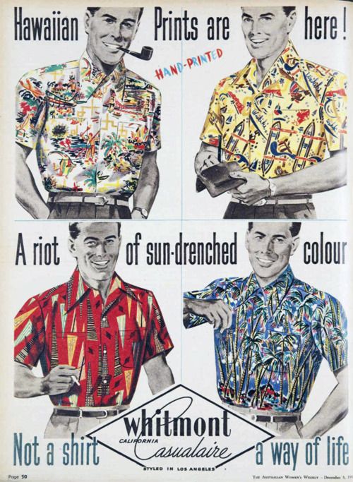 ในช่วงแรกๆการผลิตเสื้อฮาวายในยุค 50's ก็จะเป็นผ้าบางใส่สบายเอากับการเล่นทะเล เพราะที่นั้นลมแรงและร้อนมากจึงไม่ควรที่จะใส่เสื้อหนาๆ การผลิตเสื้อฮาวายก็หยิบเอา signature ของเกาะฮาวายมาไว้ในเสื้ออย่างเช่น ต้นมะพร้าว กระดานsurf หญิงสาวใส่ชุดชาวเกาะถืออะคูเลเล่ ภาพแบบนี้ติดตาติดใจเหลือเกิน ด้วยความที่มีเอกลักษณ์จึงทำให้เสื้อฮาวายเป็นที่นิยมกันมาจนถึงทุกวันนี้