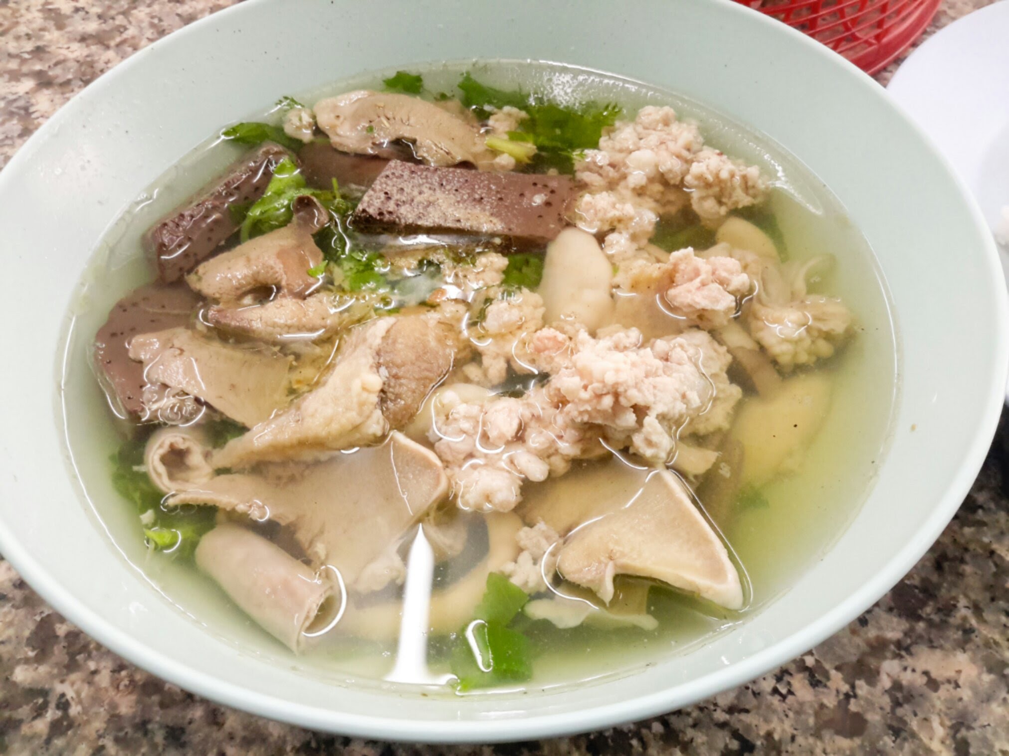 มื้อเช้า : เกาเหลาต้มเลือดหมู + ข้าวกล้อง (100 กรัม)